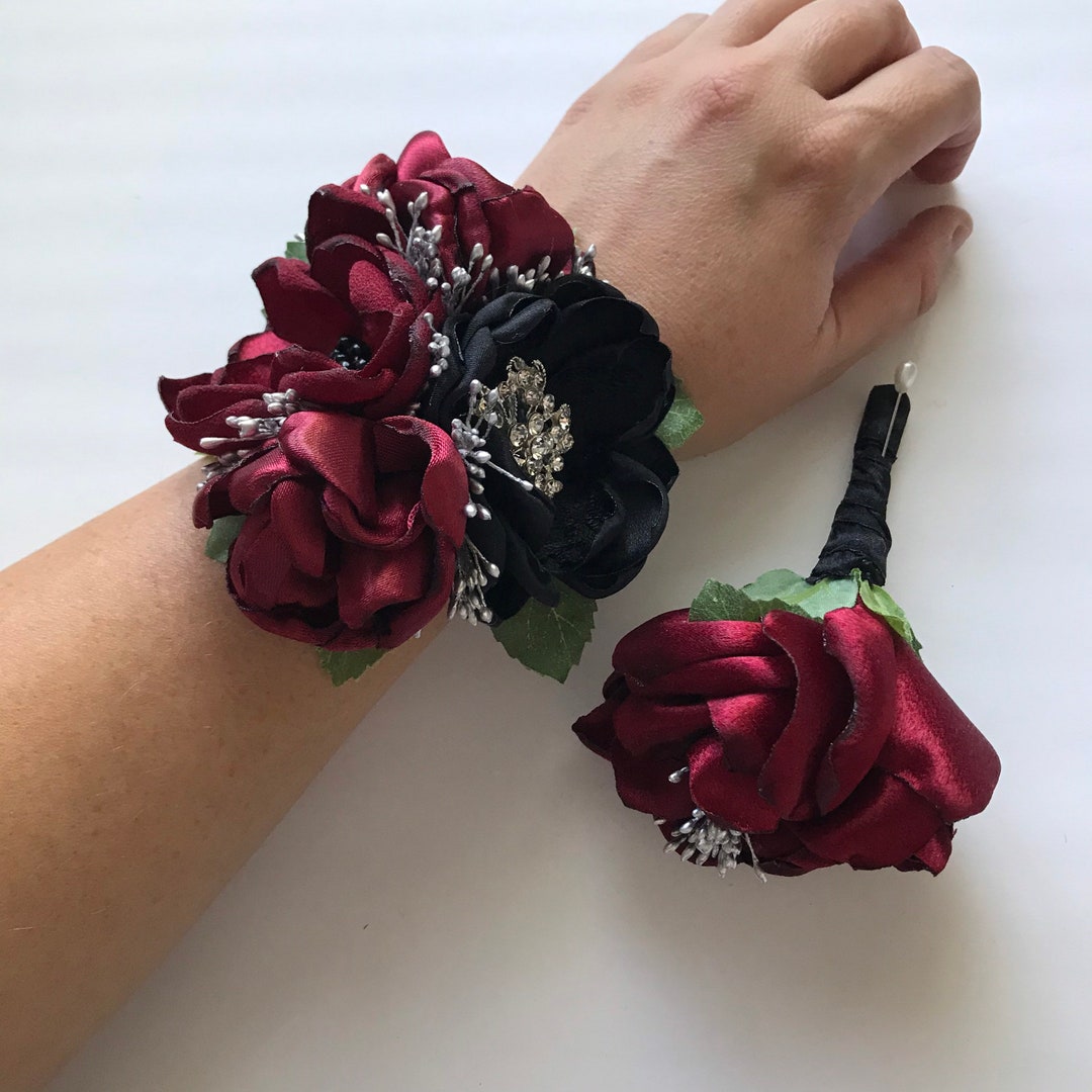 Realistic stems garlands wreaths and more. Corsage and Boutonniere Set Artificial Rose and Handmade Silk Bride Groomsmen Wrist. Black prom corsage is 4 inches wide and 6 inches high with 3 black roses white babies.